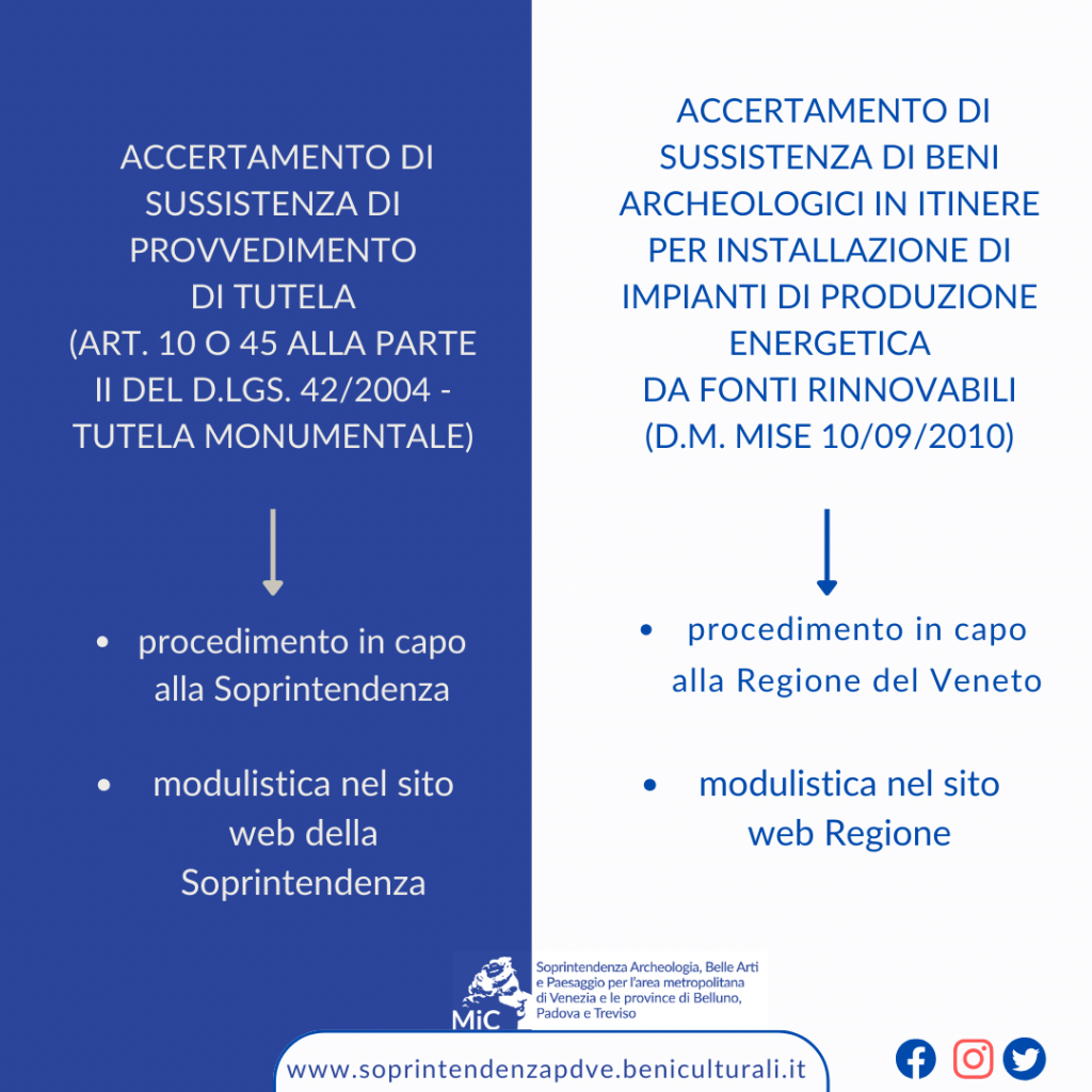 Si evidenzia che la verifica di sussistenza di procedimenti di tutela ovvero di procedure di accertamento della sussistenza di beni archeologici in itinere (ai sensi del punto 13.3 della Allegato al D.M. MISE 10 settembre 2010 – Linee guida per l’autorizzazione di impianti alimentati da fonti rinnovabili) afferisce ad un procedimento in capo alla Regione del Veneto che nulla ha a che vedere con la richiesta di accertamento di sussistenza di provvedimento di tutela, di cui ex art. 10 o 45 alla Parte II del D.lgs. 42/2004, che è invece di esclusiva competenza di questo Ufficio.