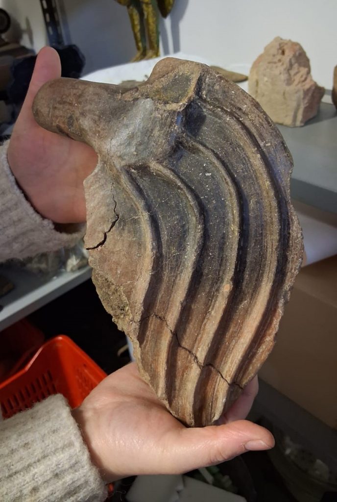 I due grandi frammenti combaciano e confermano l’appartenenza dell’oggetto alla tipologia degli alari a panca, così definiti per la loro forma caratteristica. FOTO 4